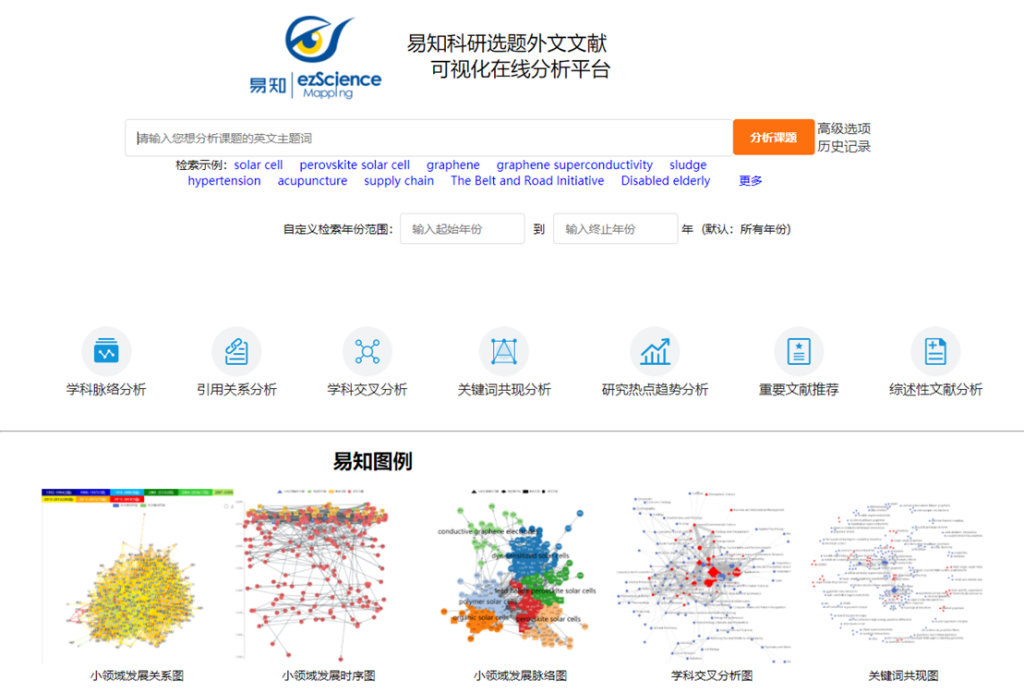 易知科研选题外文文献可视化在线分析平台(简称易知)以中科院1区2区核心优质学术资源为基础,在检索结果形成的“小领域”中整理和分析文献之间的引用关系,利用可视化技术实时生成多种图谱,帮助具有文献调研、开题选题、课题申请、论文写作等需求的学术研究人员直观清晰解读领域发展脉络,高效全面了解领域研究内容,方便快捷定位领域重要文献,提高细化选题方向的效率。